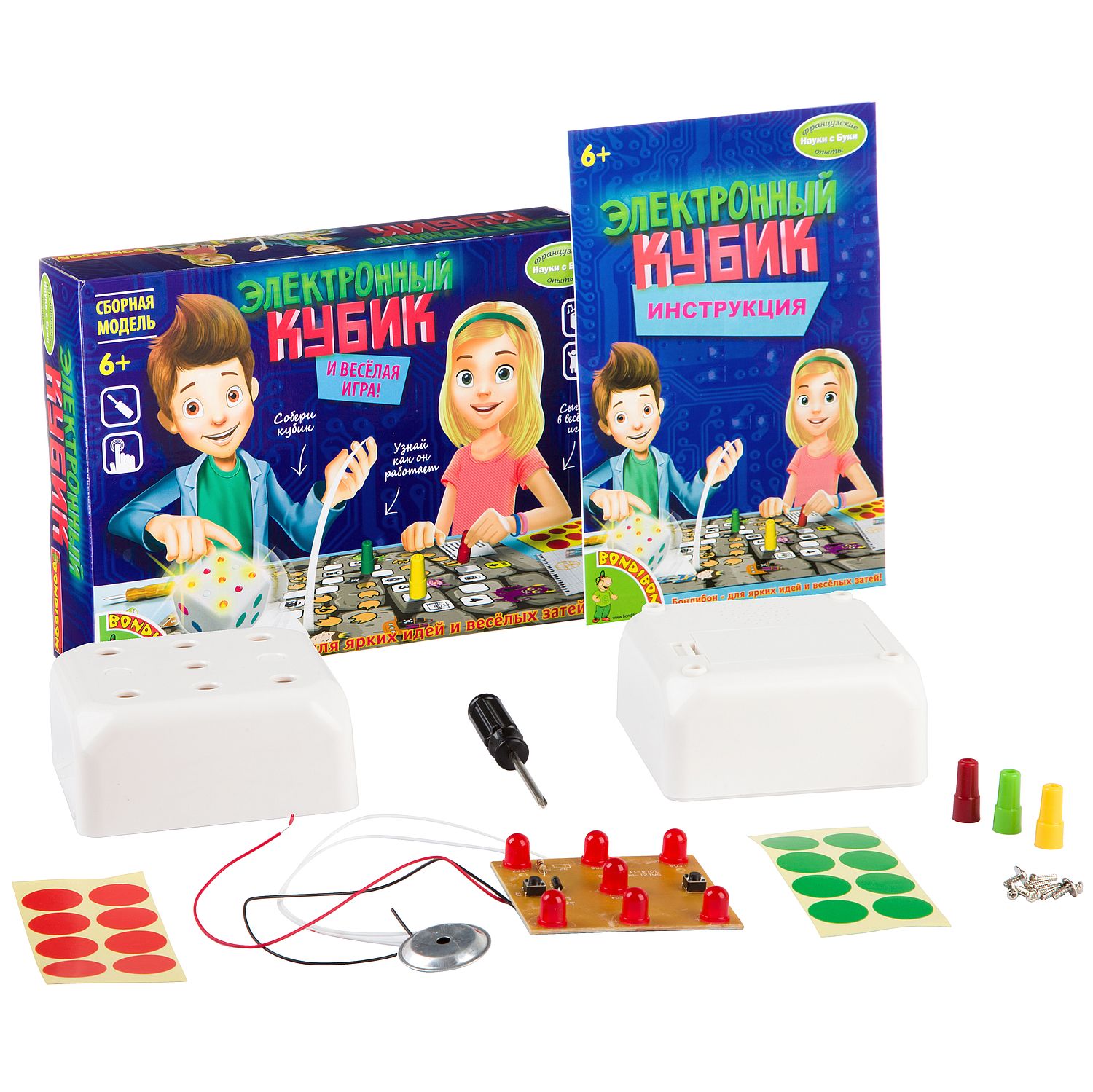 Собери электронный кубик и узнай, как он работает, сыграв в веселую настольную игру. Кубик издает звуковые сигналы и светится. Состав набора: верхняя часть кубика, кнопка, крышка отсека для батареек, печатная плата, шурупы 2 штуки, отвертка, винты с полукруглой головкой 8 штук, 3 фигурки красная, желтая, зеленая настольная игра, цветные наклейки. Дополнительно понадобятся - 2 Батарейки АА(в комплект не входят.) К набору прилагается иллюстрированная инструкция.